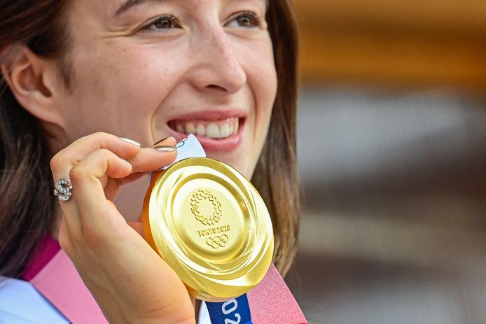 Gymnaste nina derwael pakte zondag in de finale op de brug met ongelijke leggers een historische gouden medaille.